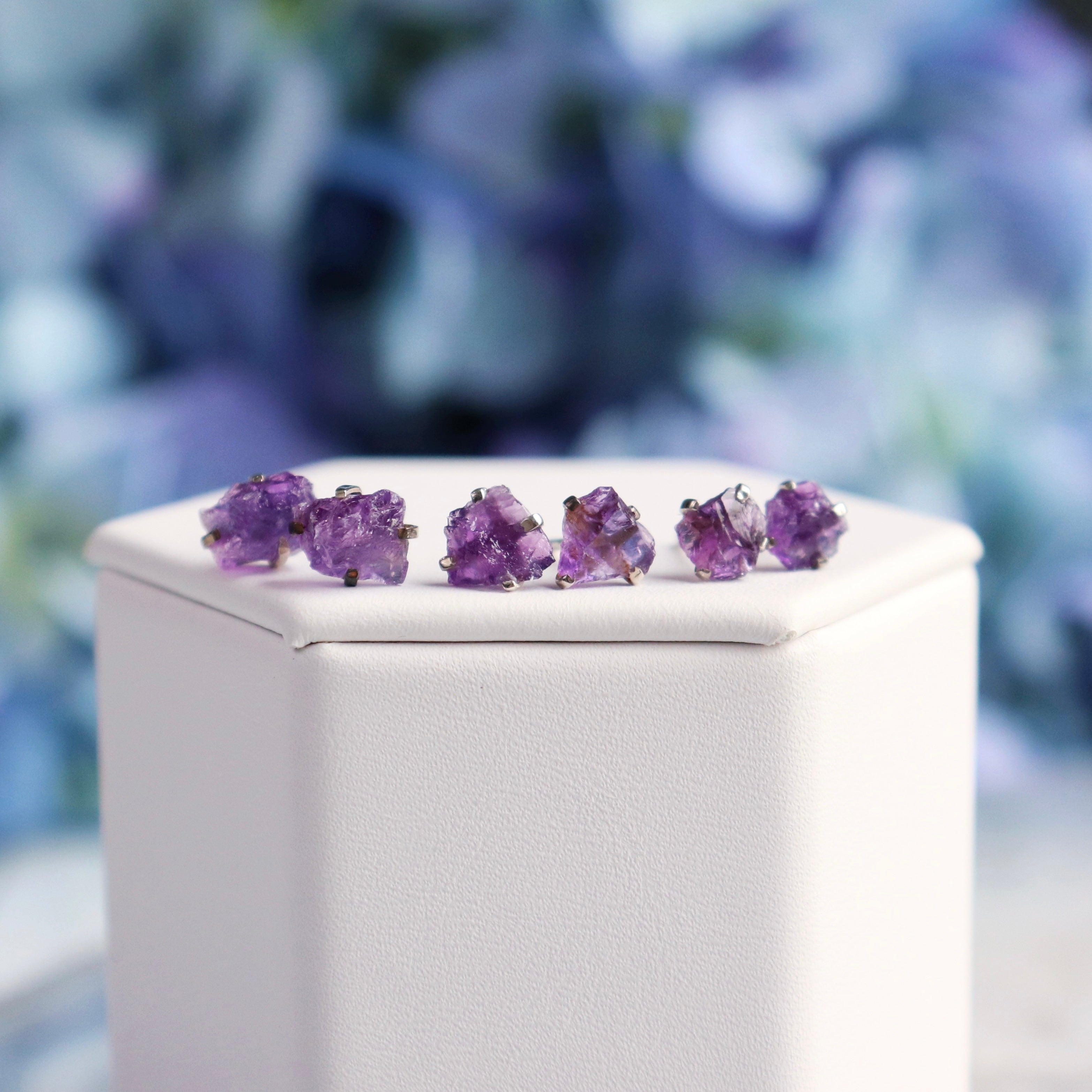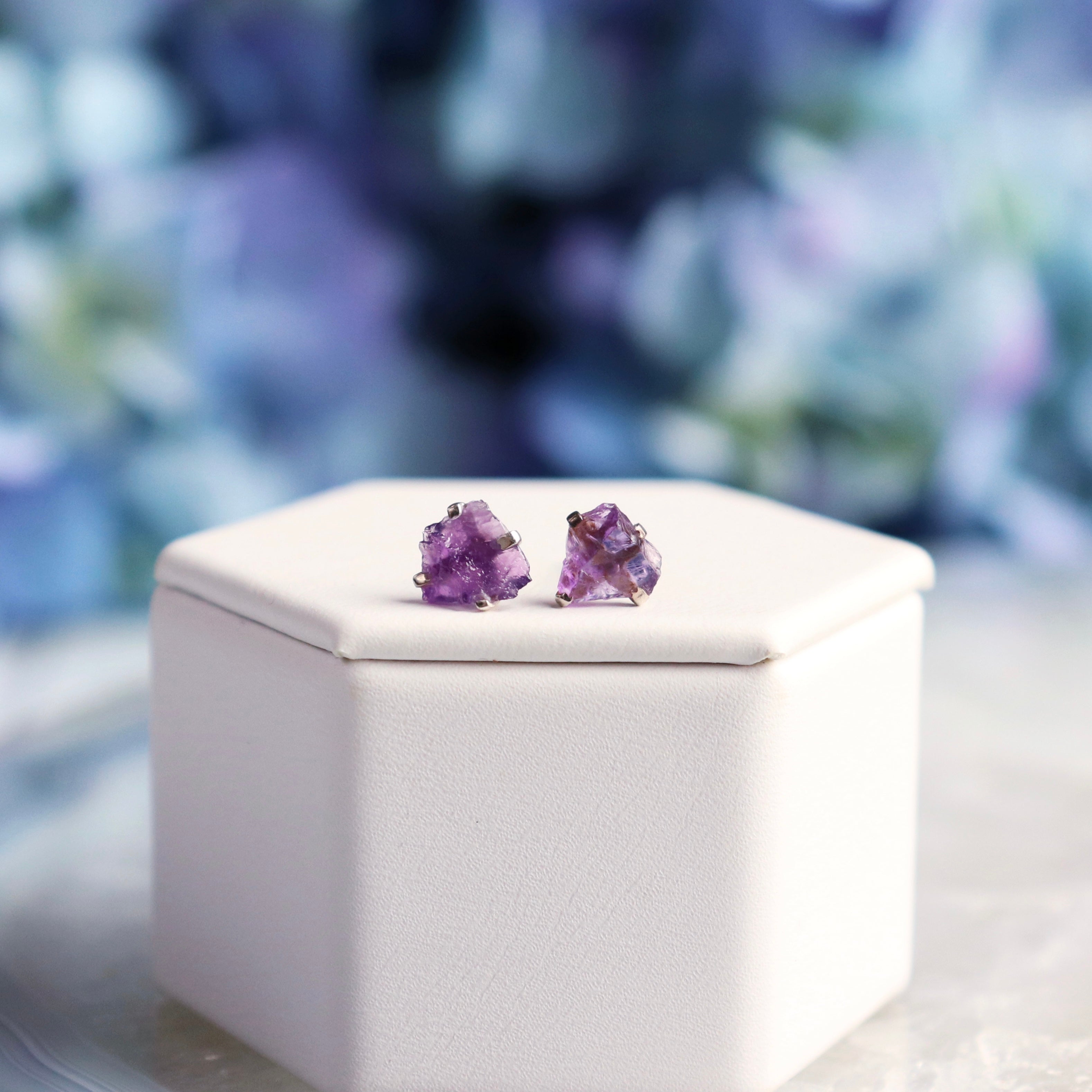 Invite creative and cleansing energy in with our Raw Amethyst Stud Earrings in a sterling silver prong setting.