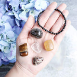 Each crystal is naturally formed, and as such, each varies slightly in shape and color. This set includes three intuitively selected Tumbles and two intuitively selected Pebbles. Our Deluxe option also includes one intuitively selected Bracelet.