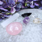 This set includes the foundational stones of Selenite, Clear Quartz, Rose Quartz, Amethyst, Obsidian, and Citrine in a diverse array of shapes such as a Wand, Heart, Palmstone, Root, Arrowhead, and Tumble.