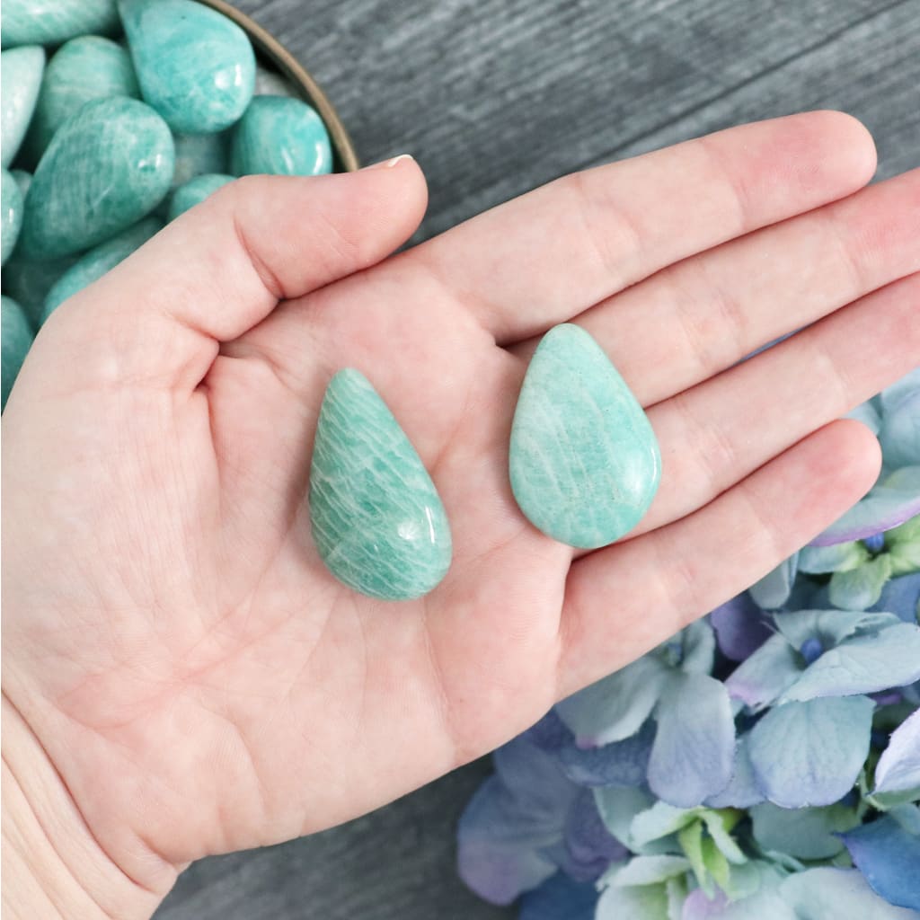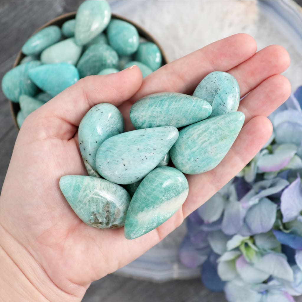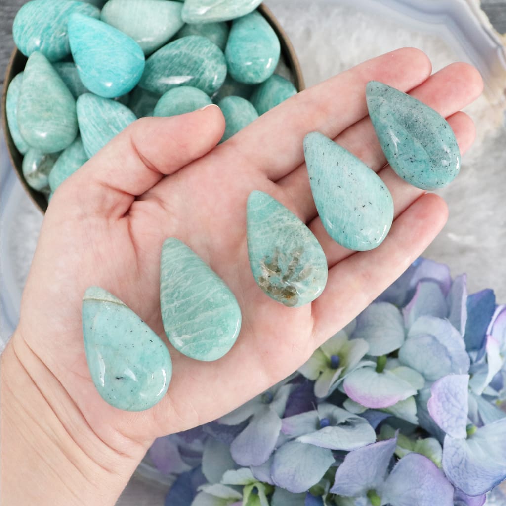 With its sweet green-blue color energy, Amazonite aids in overcoming loneliness, dispels negative energy and aggravation, soothes trauma, and alleviates worry and fear. It empowers us to set appropriate boundaries, both inwardly in terms of self-discipline, and with others in term of establishing healthy relationships.